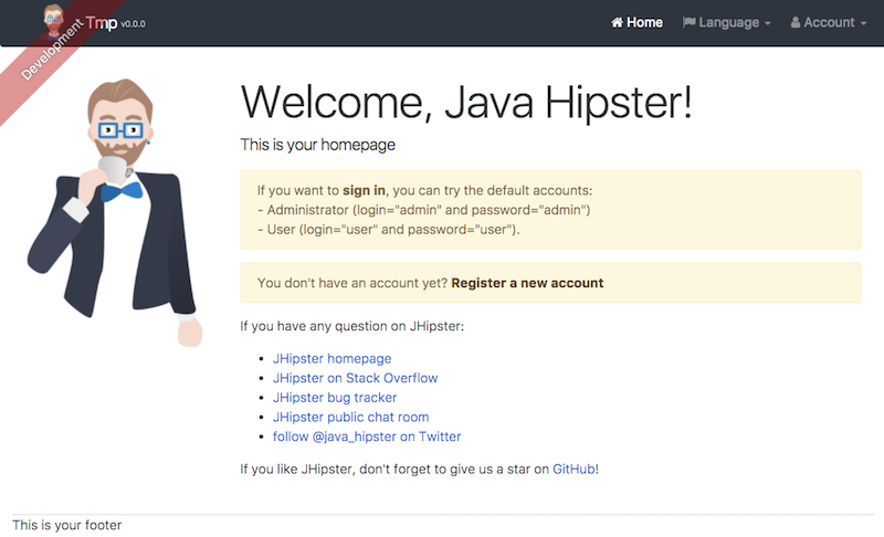 JHipster in a few minutesJHipster in 5 screenshotsOn this pageScreenshots of the generated applicationThe welcome screen The monitoring screen One of the generated forms The log management screen The generated "Book" entity